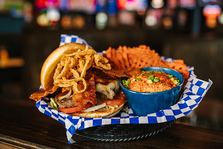 Fan favorites at Blue Moose include their award-winning jumbo wings, available with over 20 sauces and dry rubs, from mild to fiery. The hand-pattied burgers, like the classic Blue’s Big Burgers, are a hit for their juicy, fresh flavor. Appetizers such as the Blue’s Smoky Mountain Platter—featuring pretzels, beer cheese, mozzarella sticks, and boneless wings—are perfect for sharing. Unique items like the Fried Pickle Buffalo Chicken Sandwich also draw crowds. Check out these crowd-pleasers on the menu.